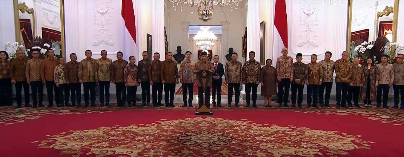 Kabinet pemerintahan Prabowo-Gibran diumumkan di Istana Kepresidenan pada Minggu malam, 20 Oktober 2024.