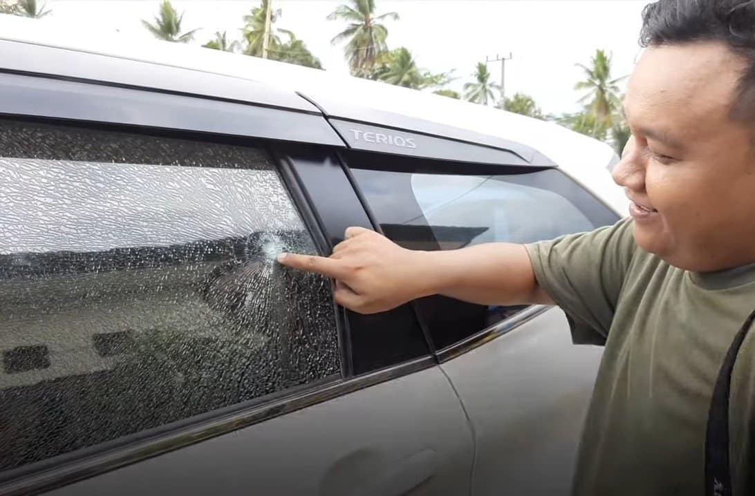 Penembakan tersebut mengakibatkan kaca sebelah kiri di kursi tengah mobil retak dan hampir berlubang.
